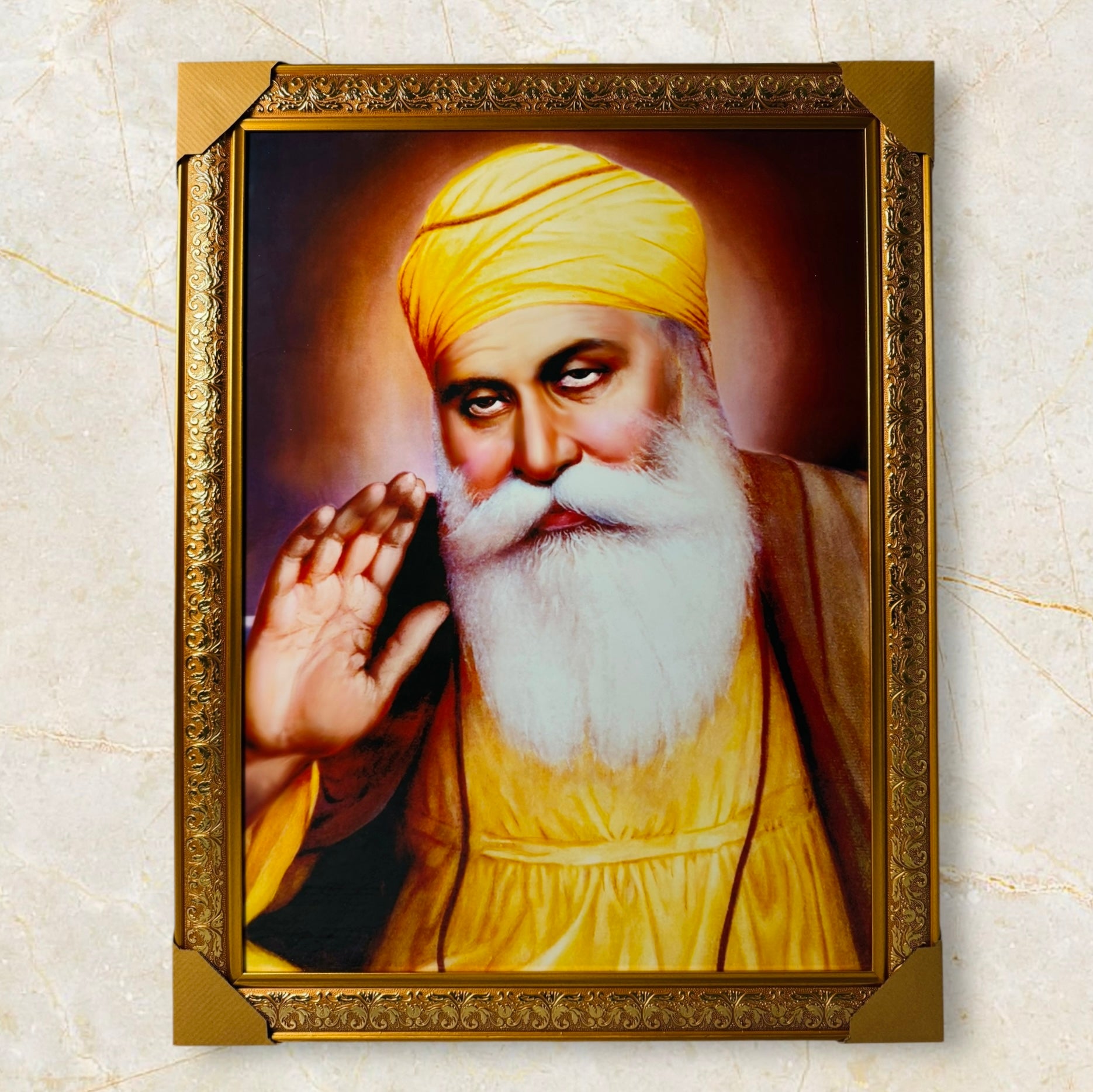 The divine presence of Guru Nanak Dev Ji with this beautifully crafted portrait, perfect for any home, office, or spiritual space.